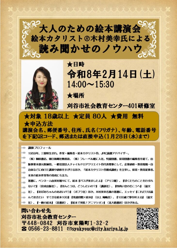 2026年2月14日(土)、刈谷市社会教育センターにて「大人のための絵本講演会」に登壇いたします。